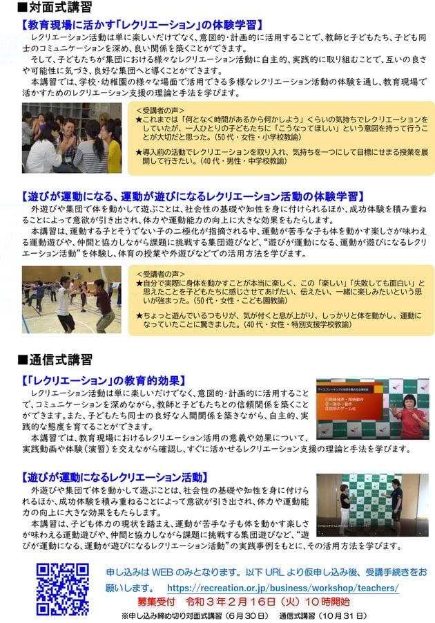 公益財団法人日本レクリエーション協会は文部科学省より教員免許状更新講習開設者として指定を受け、今年度全国39都道府県にて「レクリエーション」を主題とした”教員免許状更新講習(選択領域)”を開催します。