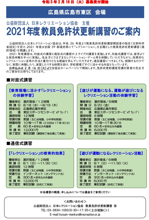 お問い合わせ:公益財団法人日本レクリエーション協会 教員免許状更新講習係