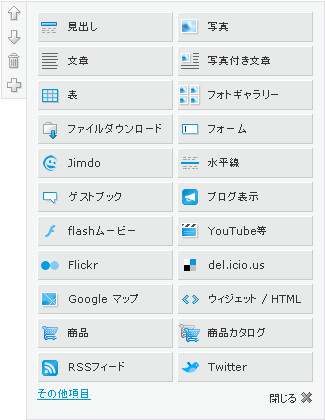Jimdoでは左の"上下ボタン" "ゴミ箱ボタン" "+ボタン"で項目の追加や削除、移動などの編集ができます。